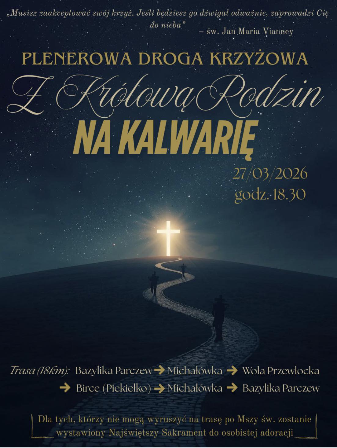 Szczególnym wydarzeniem będzie także Plenerowa Droga Krzyżowa „Z Królową Rodzin na Kalwarię” , która będzie miała miejsce w piątek, 27 marca o godzinie 18.30 po Mszy świętej w Parczewskiej Bazylice. Trasa liczyć będzie około 18 kilometrów. Uczestnicy przejdą przez kilka miejscowości, zatrzymując się przy kolejnych stacjach, rozważając Mękę Chrystusa.