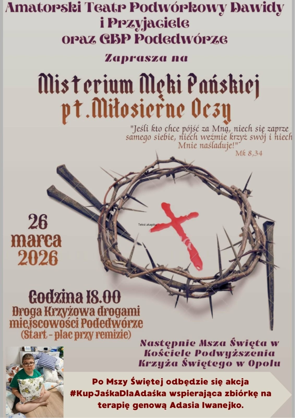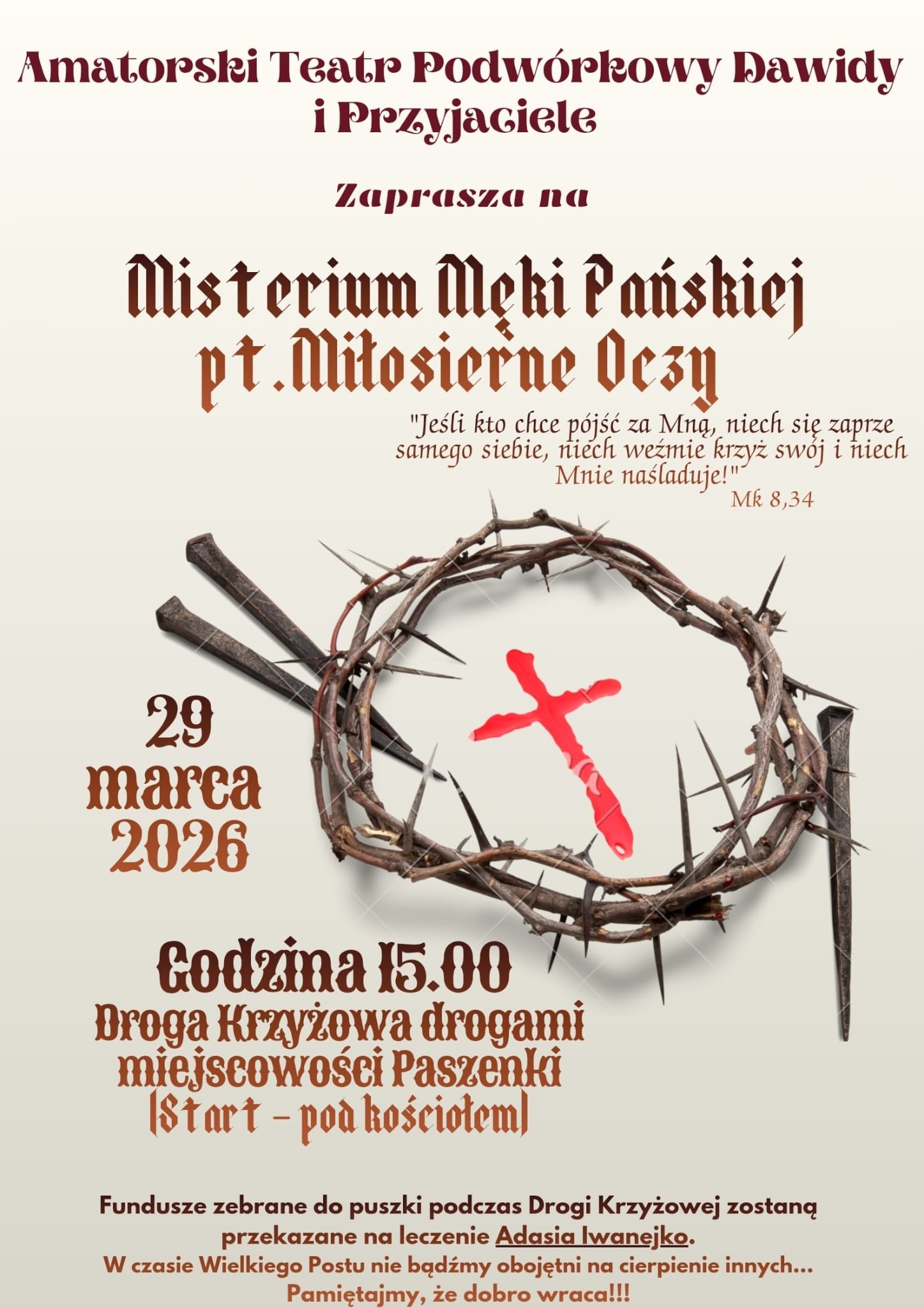 W tym roku wierni z parafii w Podedwórzu, Paszenkach, Milanowie i Siemieniu będą mogli przeżywać historię Męki Chrystusa w szczególny sposób dzięki plenerowym widowiskom przygotowanym przez lokalne społeczności. Każde z tych wydarzeń to efekt zaangażowania mieszkańców – zarówno amatorów, jak i osób od lat związanych z lokalnymi inicjatywami kulturalno-religijnymi.W role biblijnych postaci wcielą się mieszkańcy, wprowadzając wszystkich uczestników w klimat zadumy i refleksji nad ostatnią drogą Jezusa Chrystusa. Szczegółowe informacje dotyczące rozpoczęcia każdego widowiska znajdują się na plakatach poniżej.