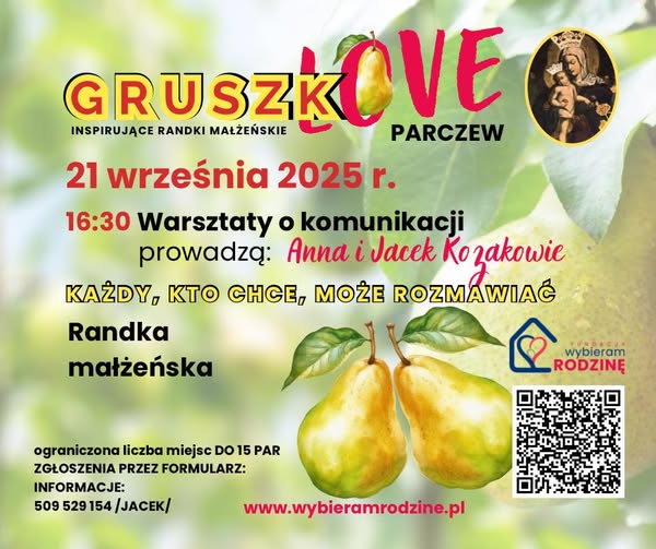 W Sanktuarium Matki Bożej Królowej Rodzin, już w niedzielę, 21 września, odbędzie się spotkanie z cyklu Gruszkowe LOVE - randka o komunikacji dla małżeństw. Temat spotkania brzmi „Każdy, kto chce, może rozmawiać”. Warsztat poprowadzą Anna i Jacek Kozakowie z Fundacji Wybieram Rodzinę.- U podnóża organizacji randek Gruszkowe LOVE leży przekonanie, że o relację warto dbać na co dzień, a małżeńska miłość potrzebuje pielęgnowania, uwagi i świadomego czasu tylko dla dwojga. Naszym pragnieniem jest tworzenie przestrzeni, w której małżonkowie mogą odkrywać siebie na nowo, ucząc się rozmawiać z miłością i wzajemnym szacunkiem – mówią prowadzący spotkanie. - Dlatego Gruszkowe LOVE to nie tylko pojedyncze wydarzenie, ale część większej idei inspirowania par do regularnych randek, które budują więź i pomagają trwać w bliskości. Nieprzypadkowe jest także miejsce organizacji Randek Małżeńskich Gruszkowe LOVE – Sanktuarium Matki Bożej Królowej Rodzin w Parczewie, zwanej również Matką Bożą z gruszką. To właśnie tutaj, w wyjątkowej przestrzeni duchowej, małżeństwa mogą spotkać się nie tylko ze sobą nawzajem, ale i z Tym, który jest źródłem miłości.