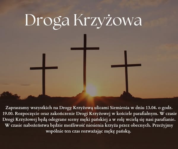 Również parafia Przemienienia Pańskiego w Siemieniu zaprasza na drogę krzyżową ulicami miejscowości, organizowaną po raz pierwszy. Nabożeństwo rozpocznie się o 19:00 w kościele parafialnym. W jego trakcie parafianie odegrają sceny Męki Pańskiej.