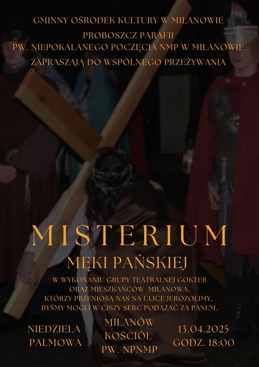 W parafii Niepokalanego Poczęcia Najświętszej Maryi Panny w Milanowie grupa teatralna GOKTER oraz mieszkańcy miejscowości zaprezentują Misterium Męki Pańskiej, które rozpocznie się o 18:00. Przedstawienie przybliży parafianom ostatnią drogę Pana Jezusa.