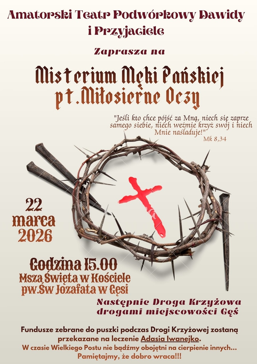 Amatorski Teatr Podwórkowy Dawidy i Przyjaciele zapraszają na Misterium Męki Pańskiej pt. „Miłosierne Oczy”. Przedstawienie będzie częścią wspólnego przeżywania drogi krzyżowej i ma na celu przypomnienie najważniejszych momentów z ostatnich godzin życia Jezusa. Organizatorzy podkreślają, że wydarzenie ma charakter otwarty i każdy może w nim uczestniczyć.W niedzielę 22 marca, o godzinie 15.00, w kościele św. Jozafata w Gęsi sprawowana będzie Msza święta. Po liturgii uczestnicy wyruszą na plenerową Drogę Krzyżową ulicami miejscowości, podczas której zaprezentowane zostaną sceny przygotowane przez lokalnych aktorów.