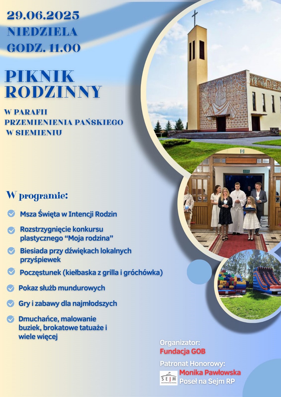 Parafia Przemienienia Pańskiego w Siemieniu zaprasza całe rodziny, nie tylko z parafii, na Piknik Rodzinny. Będzie to okazja do integracji, dobrej zabawy i rodzinnego spędzenia czasu.