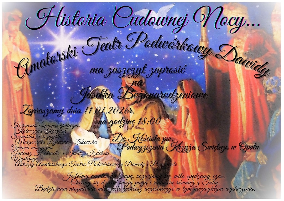 Uzupełnieniem muzycznych wydarzeń będzie przedstawienie teatralne ukazujące sceny związane z narodzinami Jezusa, które odbędzie się w niedzielę, 11 stycznia o godz. 18:00, w kościele Podwyższenia Krzyża Świętego w Opolu. Aktorzy Amatorskiego Teatru Podwórkowego z Dawidów z dużym zaangażowaniem i dbałością o szczegóły przybliżą widzom biblijną historię Bożego Narodzenia.