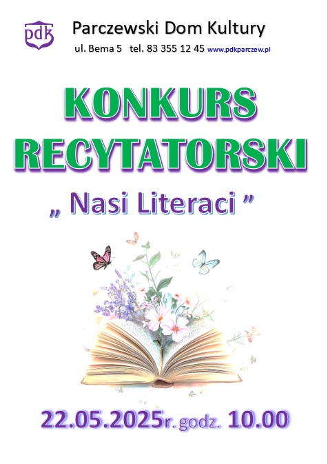 Turniej Główny Konkursu Recytatorskiego pn. „Nasi Literaci” odbędzie się 22 maja o godz. 10:00 przy ul. Bema 5. Repertuar uczestnika stanowić mają dwa utwory różnych autorów związanych z Parczewem, ponieważ celem przedsięwzięcia jest popularyzacja ich twórczości literackiej. Kryterium oceny recytacji stanowić będzie dobór repertuaru, dykcja recytatora, interpretacja utworu, a także ogólny wyraz artystyczny.Regulamin na stronie internetowej PDK www.pdkparczew.pl
