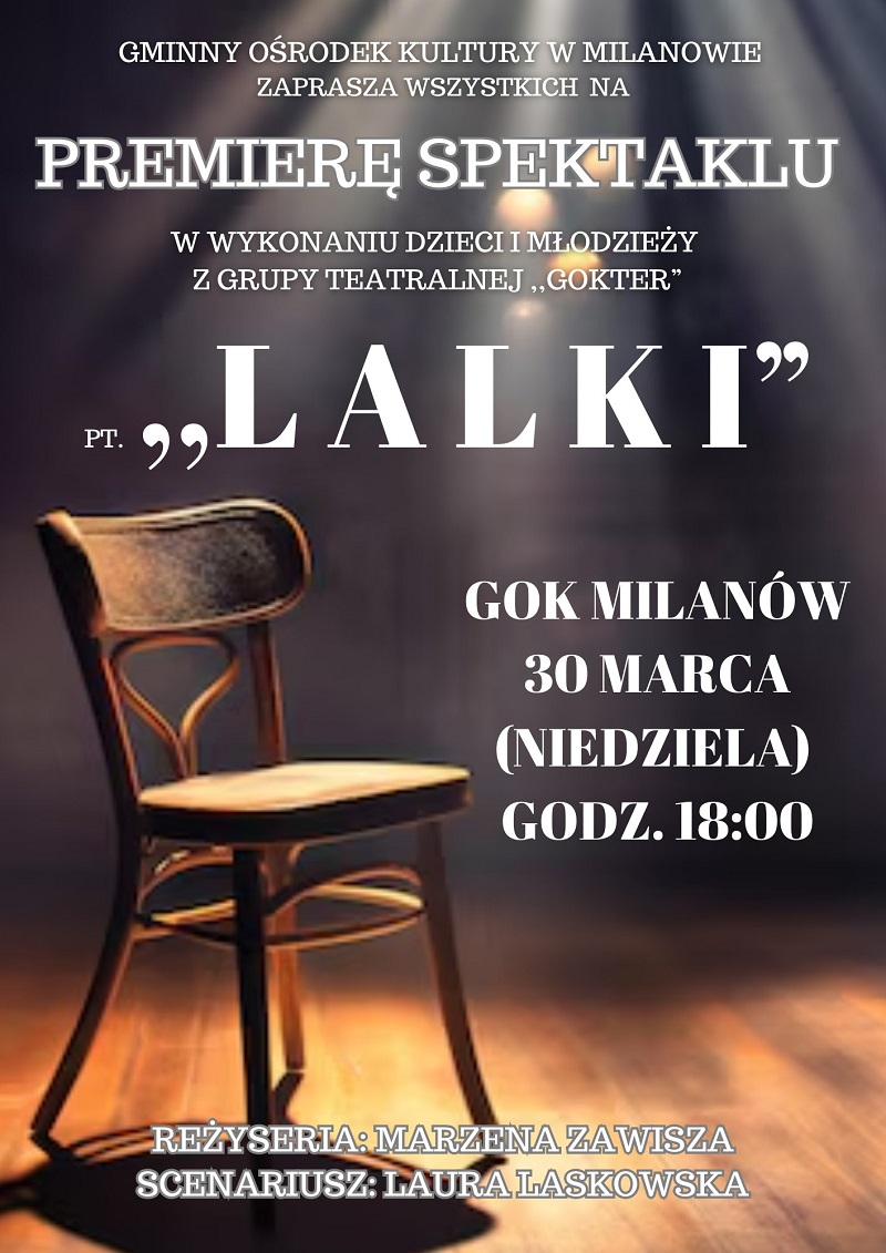 Gminny Ośrodek Kultury w Milanowie zaprasza na premierę spektaklu pt. „LALKI" w wykonaniu dzieci i młodzieży należącej do grupy teatralnej GOKTER". Premiera odbędzie się w najbliższą niedzielę, 30 marca, o godz. 18:00, na scenie Gminnego Ośrodka Kultury.