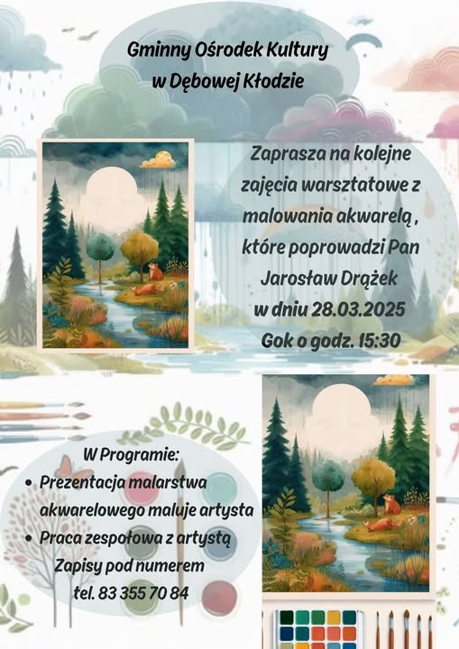 Gminny Ośrodek Kultury oraz Gminna Biblioteka Publiczna w Dębowej Kłodzie po raz kolejny organizują warsztaty malowania akwarelą, które poprowadzi Jarosław Drążek, absolwent Liceum Plastycznego i Wydziału Sztuki UMCS w Lublinie.