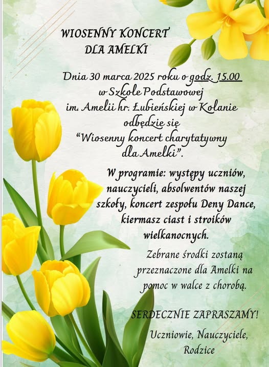 Szkoła Podstawowa im. Amelii Łubieńskiej w Kolanie zaprasza wszystkich chętnych, którzy chcieliby wesprzeć finansowo rehabilitację Amelii Karwackiej, do wzięcia udziału w kiermaszu, który odbędzie się w niedzielę, 30 marca, o godz. 15:00. Amelka jest uczennicą drugiej klasy liceum. Po zdiagnozowaniu u niej ostrej białaczki limfoblastycznej typu B, dziewczyna cały czas przebywa w szpitalu. W związku z tym, że długo leży, pojawił się zanik mięśni i skolioza. Dlatego niezbędne są pieniądze na jej rehabilitację.