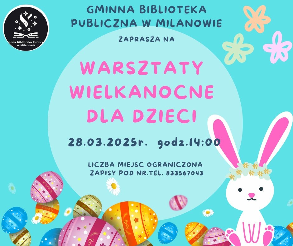 Wielkanoc coraz bliżej, dlatego Gminna Biblioteka Publiczna w Milanowie zaprasza wszystkie dzieci powyżej 6. roku życia na wyjątkowe i pełne radości Wielkanocne Warsztaty, na których uczestnicy wykonają ozdoby świąteczne. Zajęcia odbędą się w piątek, 28 marca, o godz. 14:00.