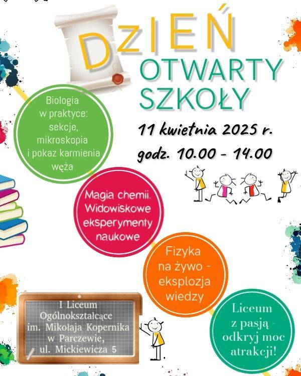 W czwartek, 10 kwietnia, w swoje progi zaprasza Zespół Szkół im. Stanisława Staszica. W czasie Dnia Otwartego będzie można poznać ofertę edukacyjną szkoły, zobaczyć nowoczesne pracownie i warsztaty, a także spotkać uczniów i nauczycieli, którzy opowiedzą, jak wygląda nauka zawodów praktycznych.Natomiast w piątek, 11 kwietnia, I Liceum Ogólnokształcące im. Mikołaja Kopernika otworzy drzwi dla przyszłych uczniów. Szkoła na ten dzień przygotowała ciekawe pokazy, eksperymenty naukowe oraz liczne niespodzianki. Wszyscy zainteresowani będą mogli zobaczyć sale lekcyjne i pracownie przedmiotowe, a także porozmawiać z uczniami i nauczycielami.