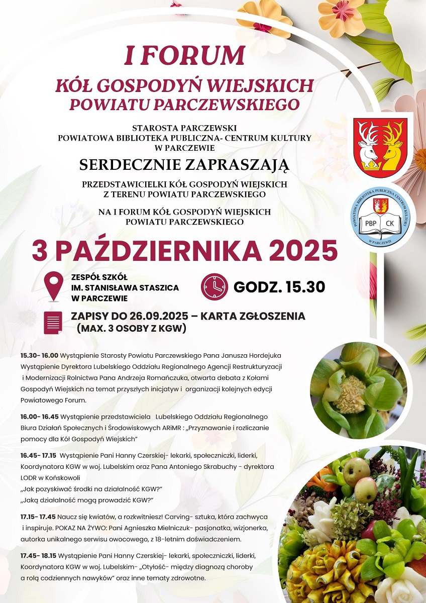 W piątek, 3 października, w Zespole Szkół im. Stanisława Staszica w Parczewie zaplanowano I Forum Kół Gospodyń Wiejskich Powiatu Parczewskiego. Celem spotkania jest integracja środowisk wiejskich, wymiana doświadczeń oraz wspólne popołudnie wypełnione inspiracjami. W programie przewidziano prelekcje i pokazy, które mają na celu wsparcie dalszego rozwoju działalności KGW.Szczegóły inicjatywy przedstawi dyrektor Powiatowej Biblioteki Publicznej – Centrum Kultury w Parczewie, Marlena Świć: