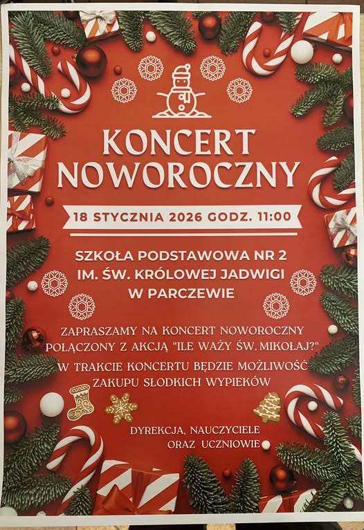 Muzyczną niedzielę otworzy Koncert Noworoczny organizowany przez Szkołę Podstawową nr 2 im. Św. Królowej Jadwigi. Podczas spotkania będzie możliwość nabycia słodkich wypieków.