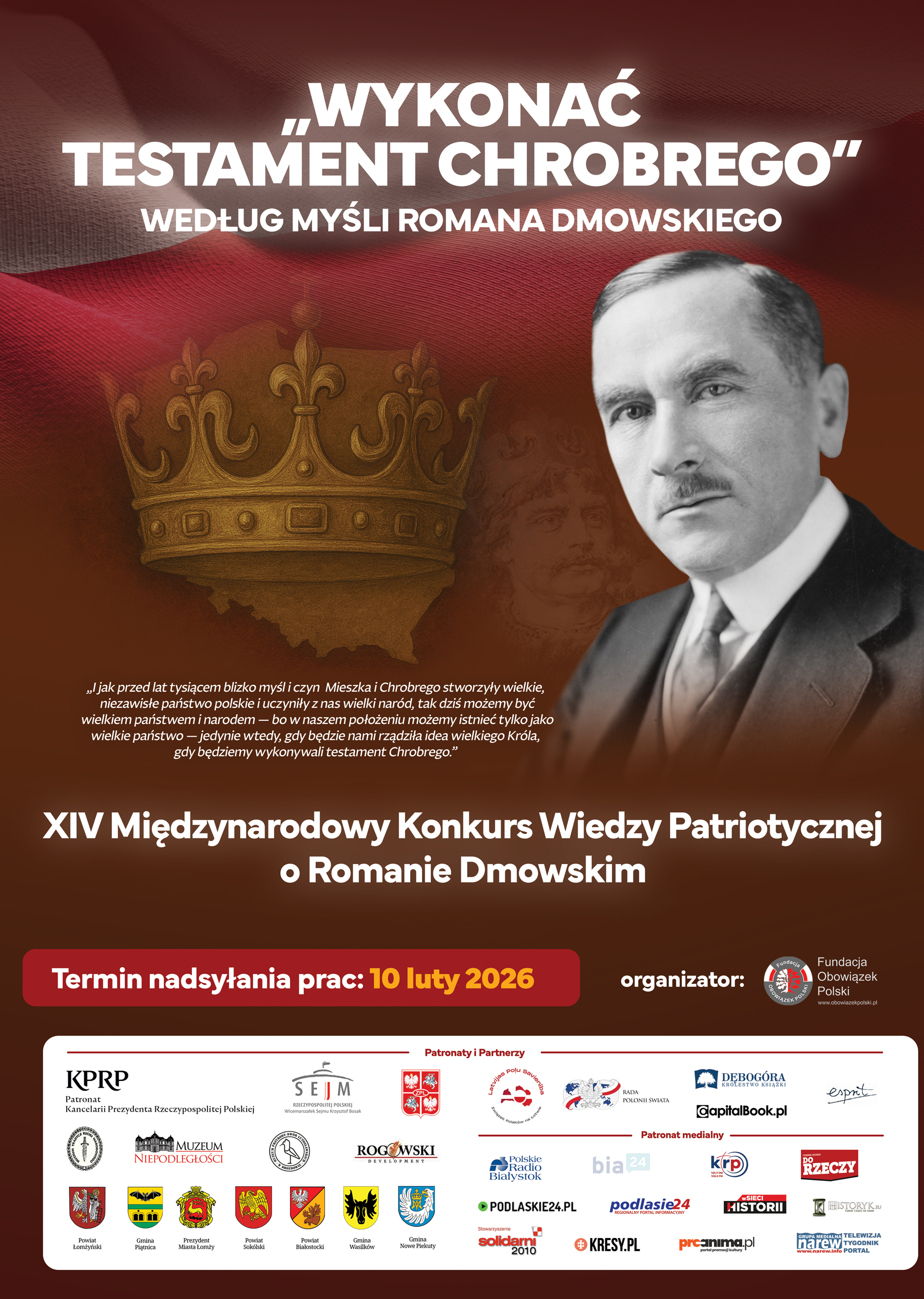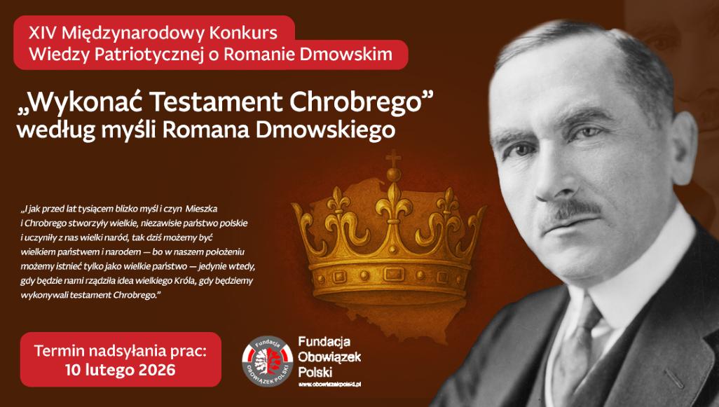 Fundacja Obowiązek Polski po raz czternasty organizuje prestiżowy Konkurs Wiedzy Patriotycznej o Romanie Dmowskim, który od lat przyciąga setki młodych ludzi z całej Polski. Podczas konferencji prasowej 14 stycznia przewodniczący kapituły konkursowej, Tomasz Madras, podkreślał, że uczestnictwo w konkursie rozwija pasję do historii, zachęca do pogłębiania wiedzy i daje szansę na zdobycie atrakcyjnych nagród.
