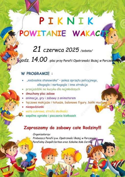 Już od kilku lat proboszcz parafii Opatrzności Bożej w Parczewie przy współpracy z Parafialnym Zespołem Caritas oraz Szkolnym Kołem Caritas organizują piknik pn. Powitanie Wakacji. Tego dnia teren przy domu parafialnym zamienia się w ogromny plac zabaw, na którym zbierają się całe rodziny, by radośnie świętować i integrować się. Tegoroczna impreza odbędzie się już w najbliższą sobotę. Początek o godzinie 14:00.