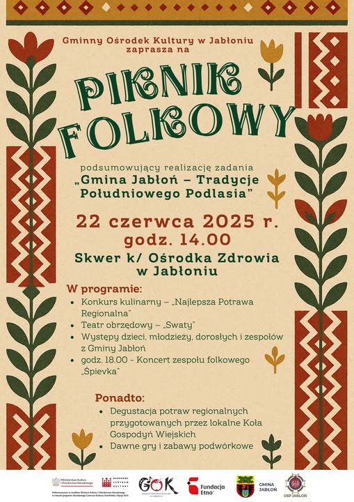 Natomiast w niedzielę, 22 czerwca, Gminny Ośrodek Kultury w Jabłoniu zaprasza na Piknik Folkowy podsumowujący realizację zadania „Gmina Jabłoń – Tradycje Południowego Podlasia”. Spotkanie rozpocznie się o godz. 14:00 na skwerze koło Ośrodka Zdrowia.
