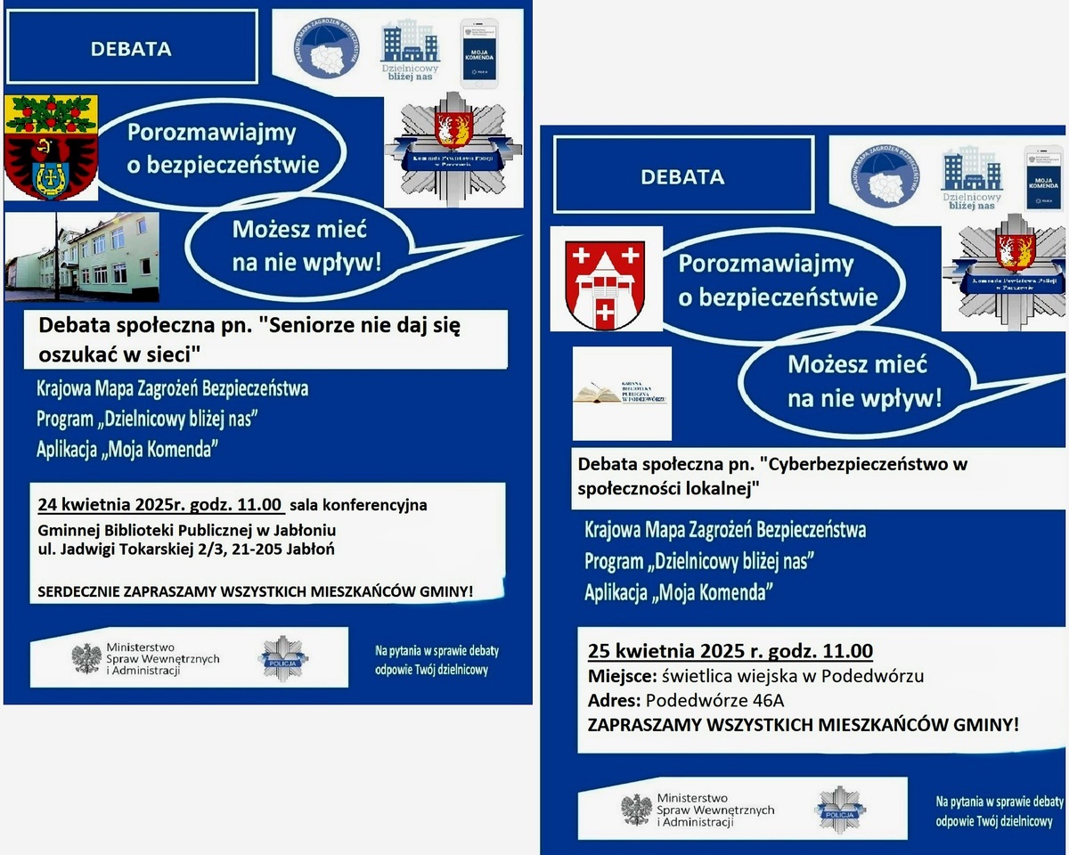 W czwartek, 24 kwietnia o godzinie 11:00 w sali konferencyjnej Gminnej Biblioteki Publicznej w Jabłoniu oraz w piątek, 25 kwietnia o godz. 11.00 w świetlicy wiejskiej w Podedwórzu odbędą się debaty społeczne pod nazwą „Seniorze nie daj się oszukać w sieci" oraz "Cyberbezpieczeństwo w społeczności lokalnej". Celem wydarzenia jest zwiększenie świadomości mieszkańców, osób starszych, szczególnie w kontekście ochrony własnej tożsamości oraz zagrożeń związanych z oszustwami przy wykorzystaniu nowych technologii.Niezależnie od „sposobów” oszustw, metoda działania oszustów jest zwykle podobna. Polega na tym, iż oszuści trafiają do upatrzonej wcześniej osoby, którą jest zazwyczaj osoba starsza, samotnie mieszkająca i podszywając się pod członka rodziny, policjanta lub pracownika spółdzielni mieszkaniowej bądź innej instytucji i pod pretekstem zaistnienia określonego zdarzenia wyłudzają pieniądze. Niejednokrotnie zdarzają się również przypadki kradzieży wartościowych przedmiotów – biżuterii, sprzętu, a także pieniędzy lub dokumentów.