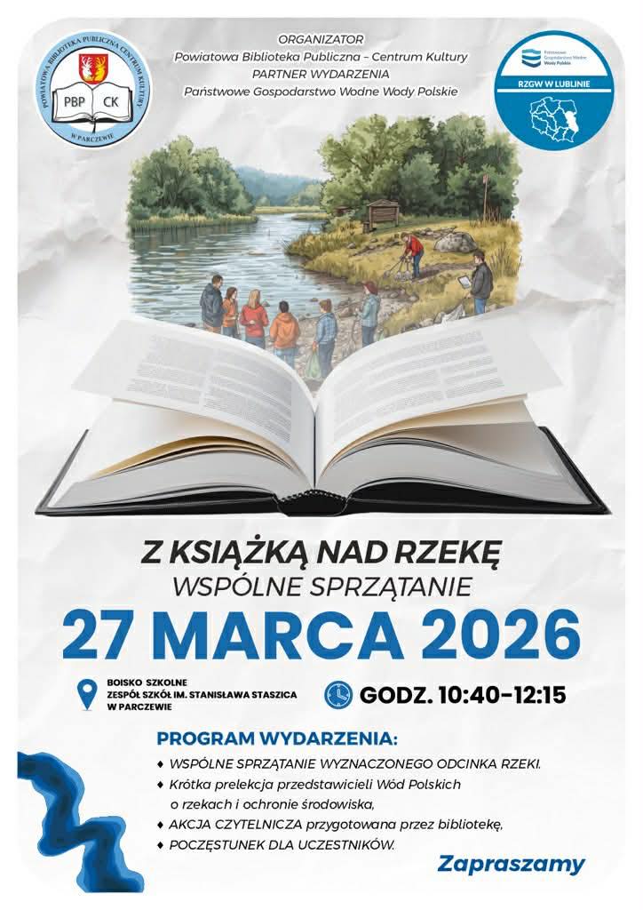 Wydarzenie pod hasłem „Z książką nad rzekę” odbędzie się w piątek, 27 marca. Rozpocznie się o godzinie 10:40 i potrwa do 12:15, a miejscem zbiórki będzie boisko szkolne Zespołu Szkół im. Stanisława Staszica w Parczewie.W programie przewidziano wspólne sprzątanie wyznaczonego odcinka rzeki, co stanowi główny punkt inicjatywy. Uczestnicy będą mogli także wysłuchać krótkiej prelekcji przedstawicieli Wód Polskich, którzy opowiedzą o rzekach i ochronie środowiska. Nie zabraknie również akcentu literackiego – organizatorzy przygotowali specjalną akcję czytelniczą, która ma zachęcić do sięgania po książki także w plenerze.