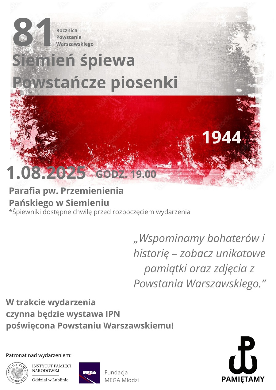 W najbliższy piątek, 1 sierpnia o godzinie 19:00 w parafii Przemienienia Pańskiego w Siemieniu, odbędzie się wyjątkowe wydarzenie – wspólne śpiewanie powstańczych piosenek z okazji 81. rocznicy wybuchu Powstania Warszawskiego. To nie tylko muzyczne spotkanie, ale również okazja, by oddać hołd tym, którzy z dźwiękiem syren stali się Bohaterami.
