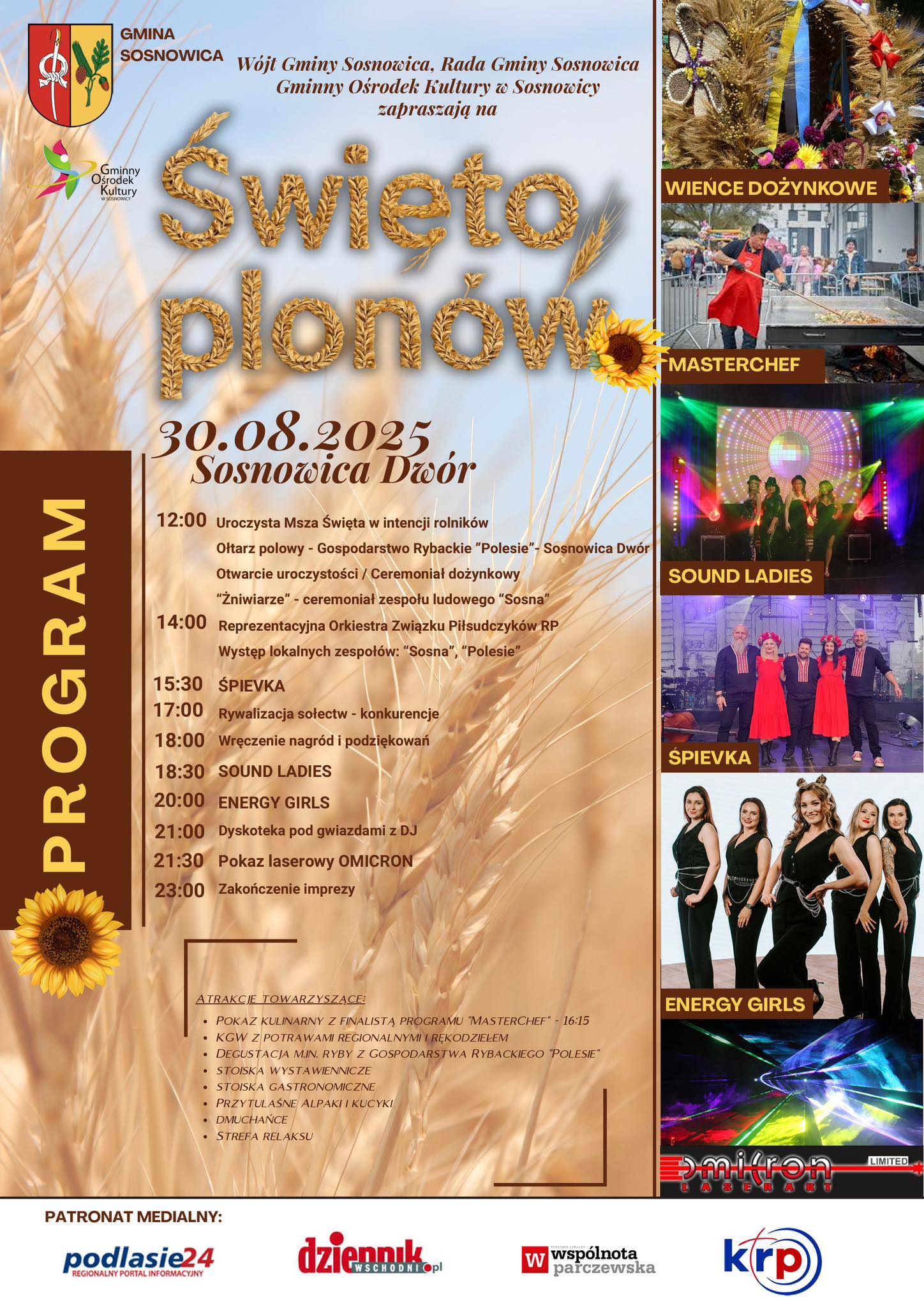 Wydarzenie, które odbędzie się w sobotę 30 sierpnia, w Gospodarstwie Rybackim „Polesie” w Sosnowica Dwór, rozpocznie uroczysta Msza święta polowa o godz. 12.00 sprawowana w intencji rolników. W programie dożynek znalazły się także ceremoniał dożynkowy „Żniwiarze” przygotowany przez zespół ludowy „Sosna”, koncert Reprezentacyjnej Orkiestry Związku Piłsudczyków RP, występy lokalnych zespołów, rywalizacja sołectw, występy muzyczne gwiazd, pokaz laserowy oraz dyskoteka pod gwiazdami.Patronat medialny nad wydarzeniem objęło Katolickie Radio Podlasie oraz portal Podlasie24.pl