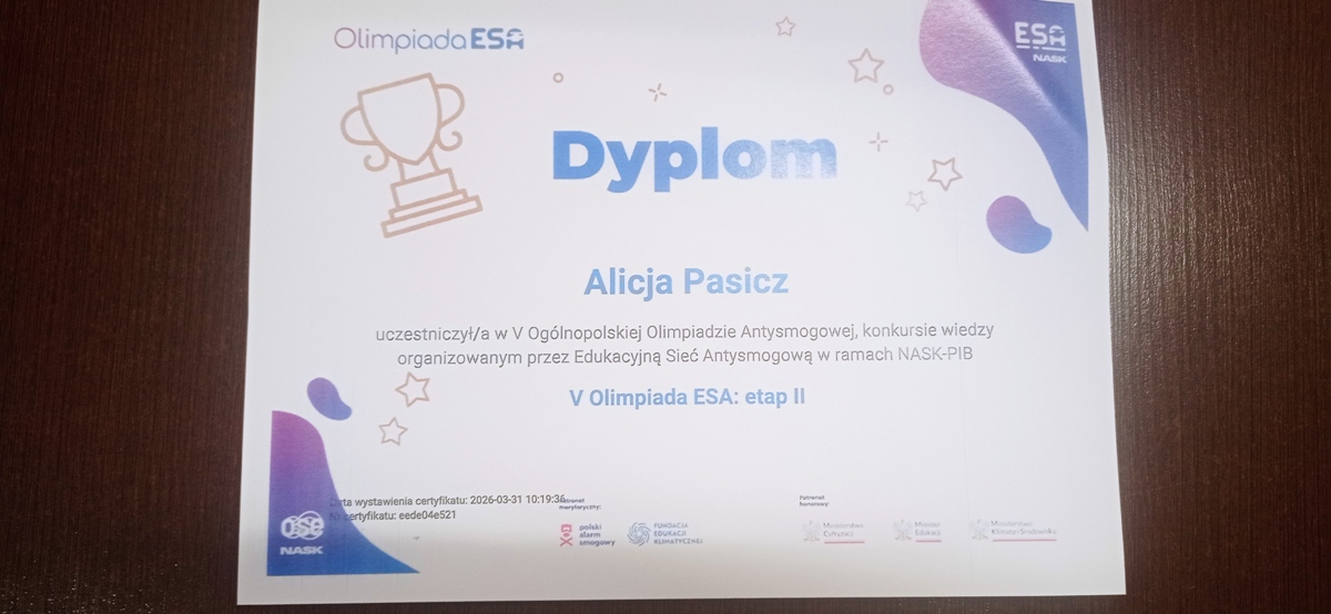 Olimpiada ESA to jedno z najważniejszych przedsięwzięć edukacyjnych w Polsce, promujących wiedzę o jakości powietrza i przeciwdziałaniu smogowi. W tegorocznej edycji udział wzięły tysiące uczniów z całego kraju. Etap wojewódzki okazał się dużym wyzwaniem, gdyż uczestnicy musieli wykazać się nie tylko wiedzą teoretyczną z zakresu ekologii, ale także umiejętnością analizy danych i znajomością nowoczesnych rozwiązań technologicznych.W tym wymagającym konkursie dobrze poradziły sobie reprezentantki szkoły: Marta Małafiejew zdobyła 78 procent, co stanowi bardzo wysoki wynik, a Alicja Pasicz uzyskała 63 procent, potwierdzając solidne przygotowanie i determinację.