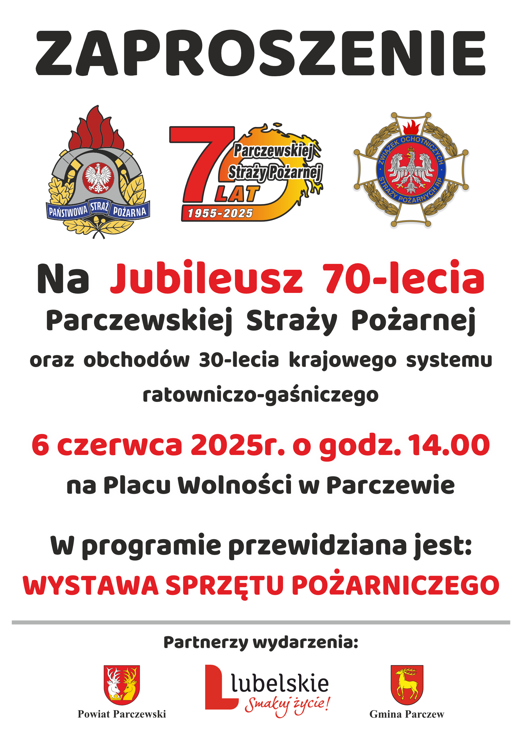 Komendant Powiatowy Państwowej Straży Pożarnej w Parczewie oraz Prezes Zarządu Oddziału Powiatowego Związku Ochotniczych Straży Pożarnych RP zapraszają mieszkańców Parczewa na uroczyste obchody 70-lecia istnienia Parczewskiej Straży Pożarnej połączone z 30-leciem krajowego systemu ratowniczo-gaśniczego w powiecie parczewskim oraz Powiatowymi Obchodami Dnia Strażaka.