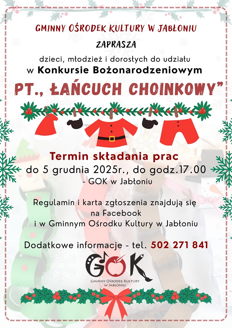 Gminny Ośrodek Kultury w Jabłoniu zaprasza do wzięcia udziału w konkursie na łańcuch choinkowy i odwiedzenia wystawy znajdującej się w galerii GOK.