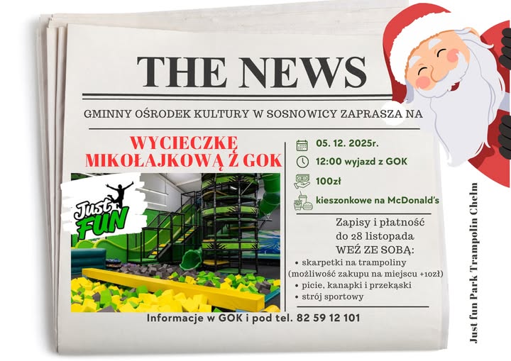 Na wycieczkę mikołajkową do parku trampolin w Chełmie zaprasza Gminny Ośrodek Kultury w Sosnowicy.