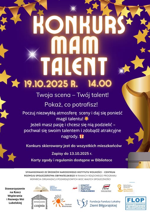 Ponadto Gminna Biblioteka Publiczna w Podedwórzu zaprasza wszystkich mieszkańców na konkurs „Mam Talent”.