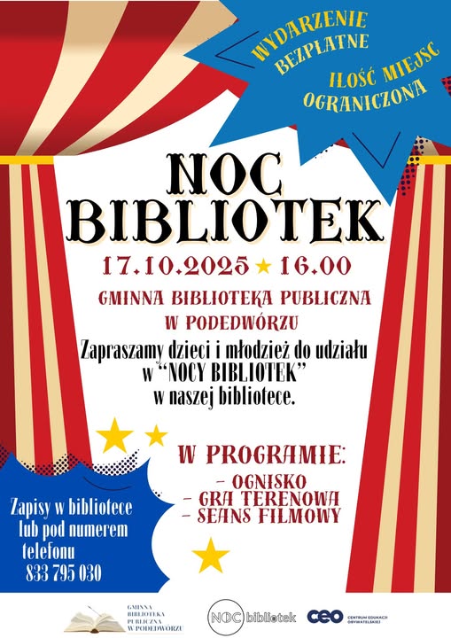 Nadchodzący weekend zdominuje Noc Bibliotek. Oprócz okazji do zapoznania się z ofertą gminnych bibliotek, będzie można spędzić czas na oglądaniu bajek, słuchaniu muzyki oraz wziąć udział w różnorodnych zabawach integracyjnych.![]() |