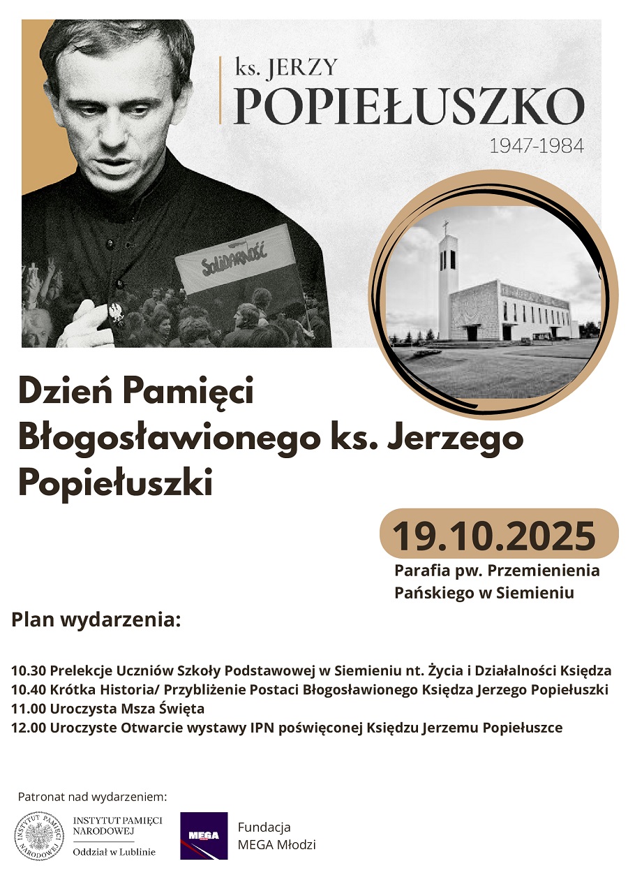 Parafia Przemienienia Pańskiego w Siemieniu zaprasza na Dzień Pamięci Błogosławionego ks. Jerzego Popiełuszki.